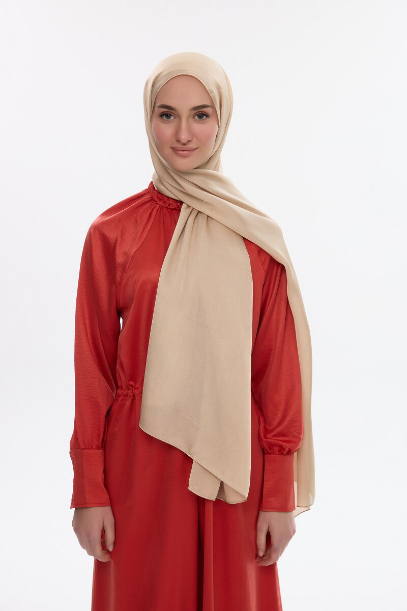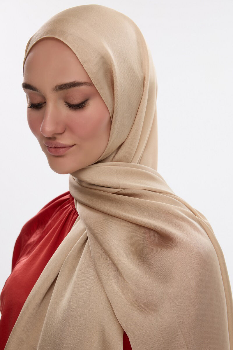 Camellia Scarfs ile şıklığınızı tamamlamak için tasarlanan bu özel İdol Saten Janjan Şal - Açık Bisküvi renk, zarafetin ve konforun mükemmel bir birleşimini sunar.