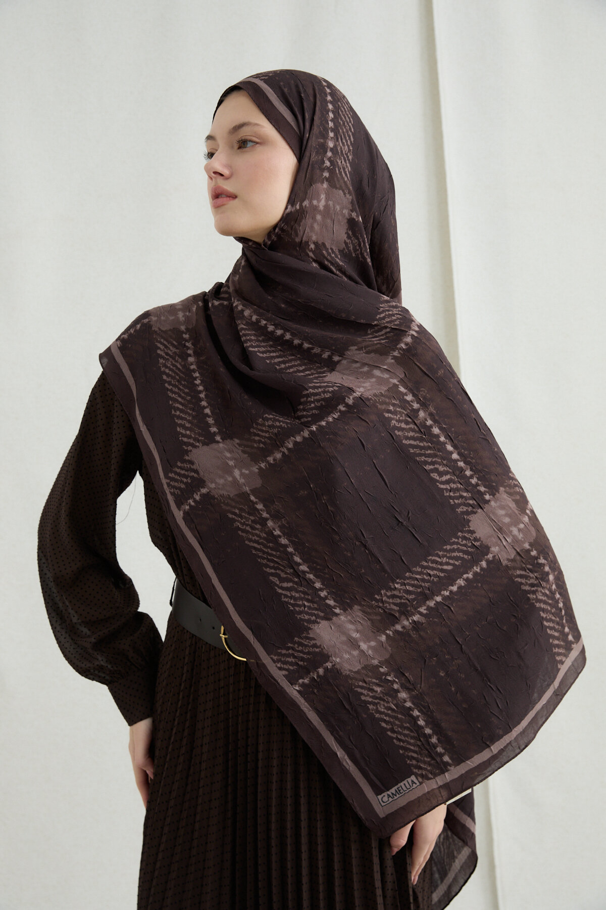 Ekose Kraş Şal koleksiyonumuzun en asil üyelerinden biri olan bu tasarım, Kahve tonunun dinginliğini modern bir dokuyla buluşturuyor. Kraş kumaşın kendinden hacimli ve hafif buruşuk yapısı, her bağlama stilinde dolgun bir görünüm sunarken; desenlerin kumaş üzerindeki dengeli dağılımı sayesinde zarafetiniz her açıdan ön plana çıkar.