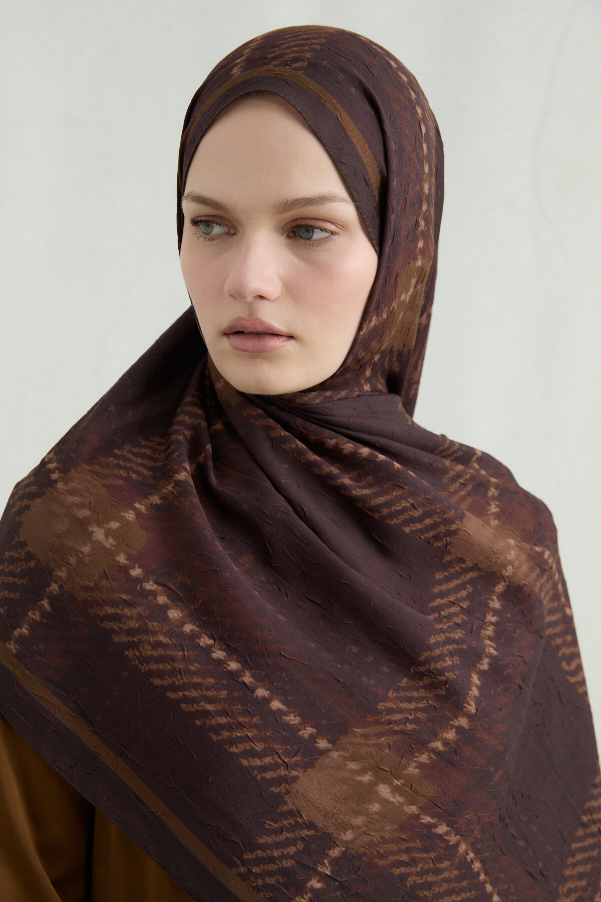 Ekose Kraş Şal koleksiyonumuzun en asil üyelerinden biri olan bu tasarım, Kızıl Kahve renginin dinginliğini modern bir dokuyla buluşturuyor. Kraş kumaşın kendinden hacimli ve hafif buruşuk yapısı, her bağlama stilinde dolgun bir görünüm sunarken; desenlerin kumaş üzerindeki dengeli dağılımı sayesinde zarafetiniz her açıdan ön plana çıkar.