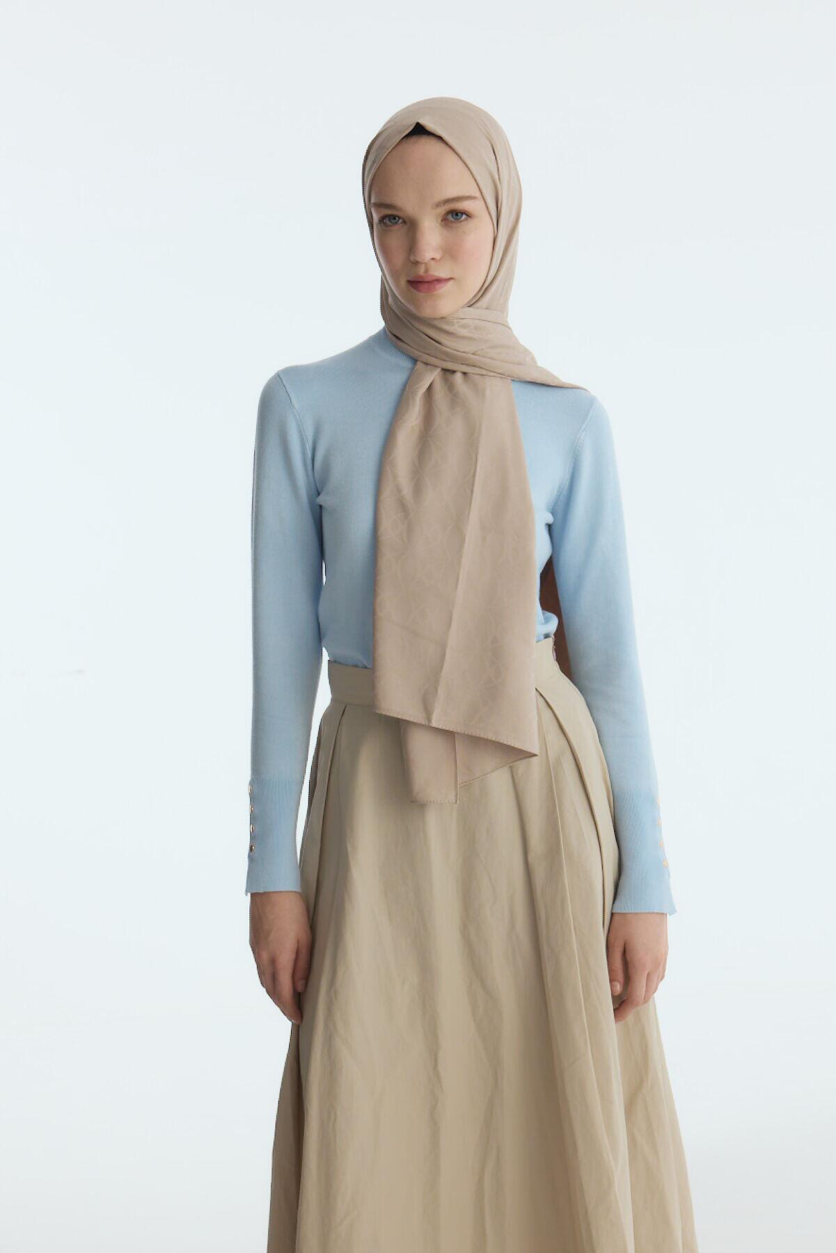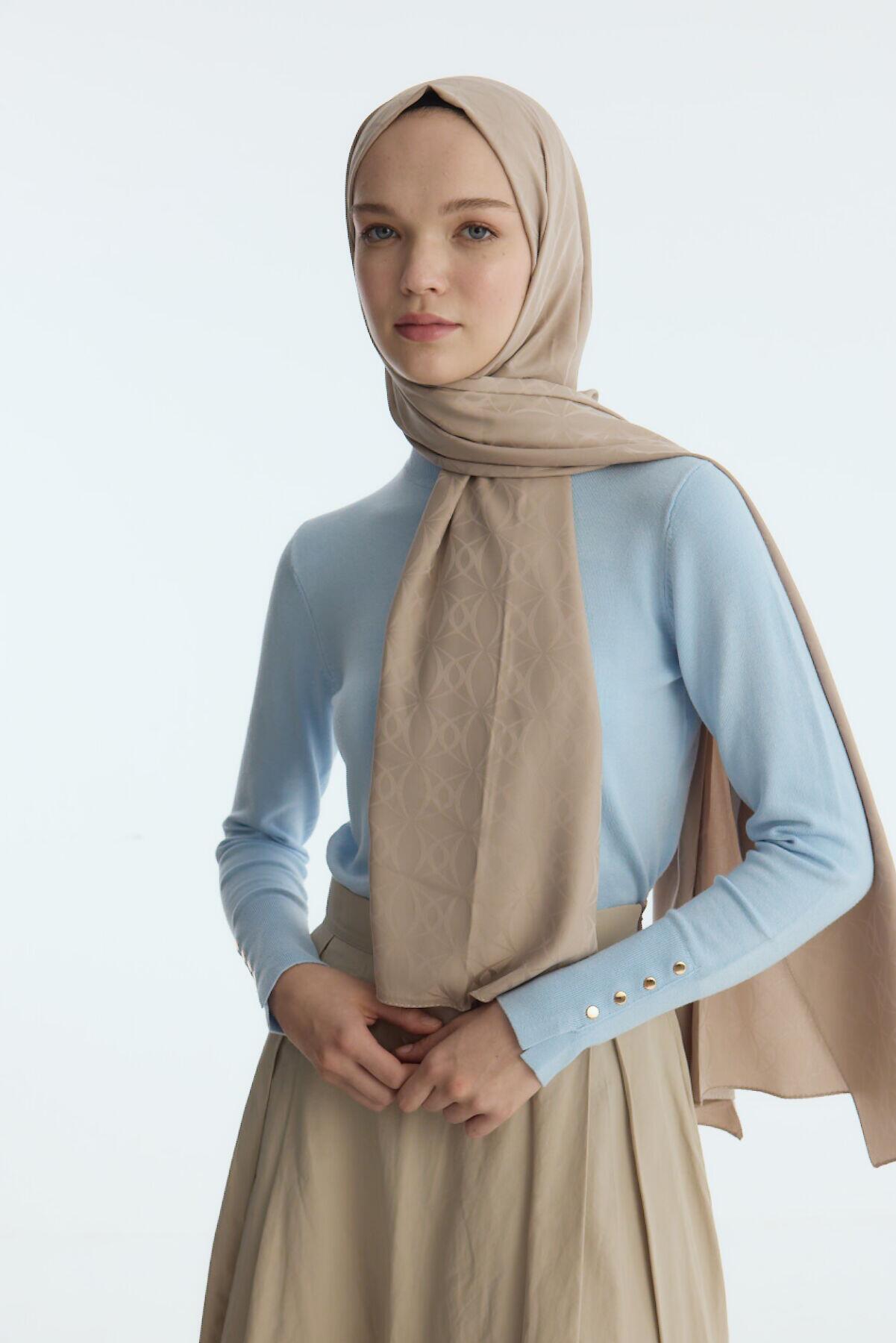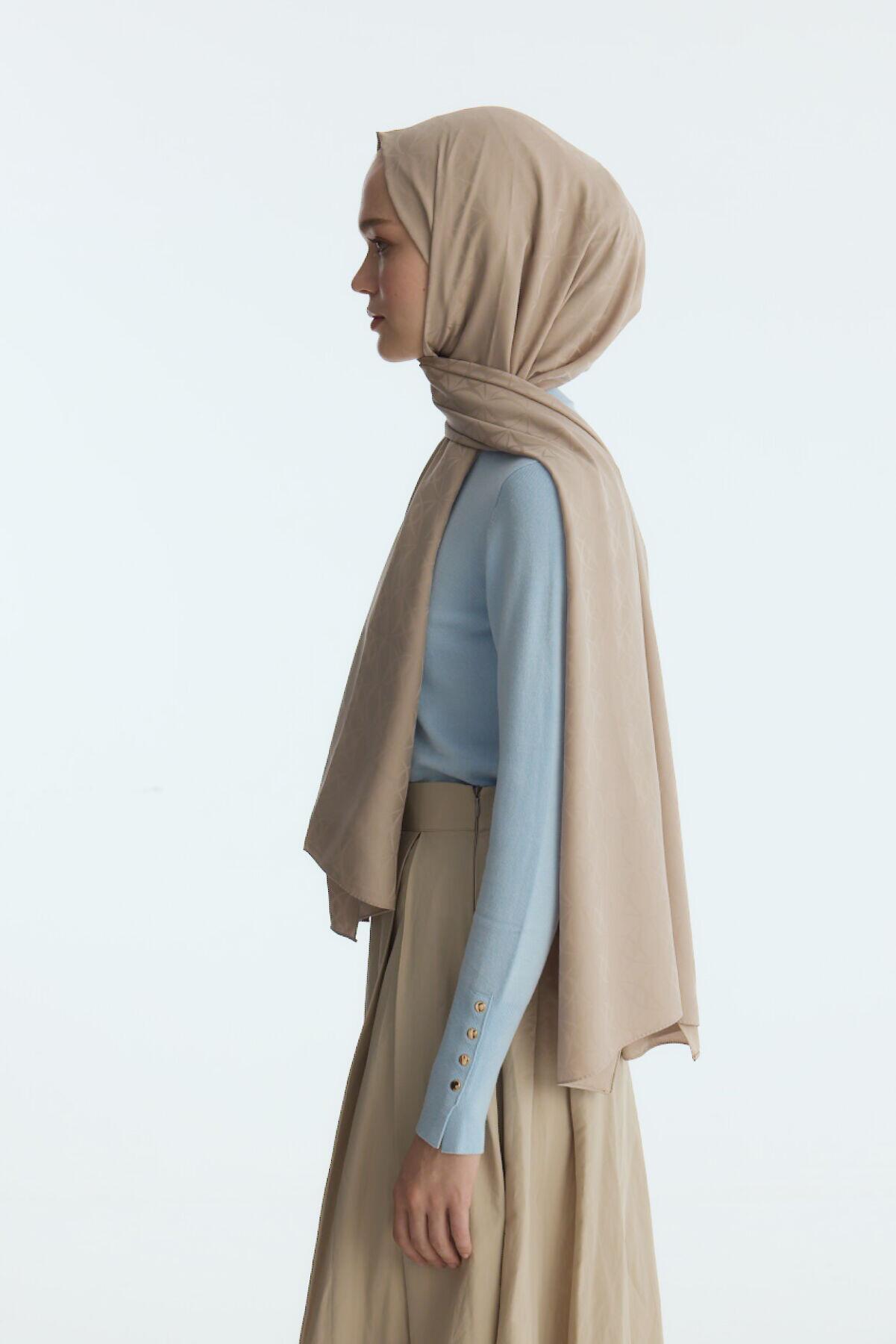 Camellia Scarf ile Asil Görünüm -İpeksi Jakar Geometrik Desen Şal - Kum şal, zarif jakar dokusu ve doğal yapısıyla her kıyafete uyum sağlar. Yumuşak ve nefes alabilen kumaşı, size her mevsim rahatlık sunar.