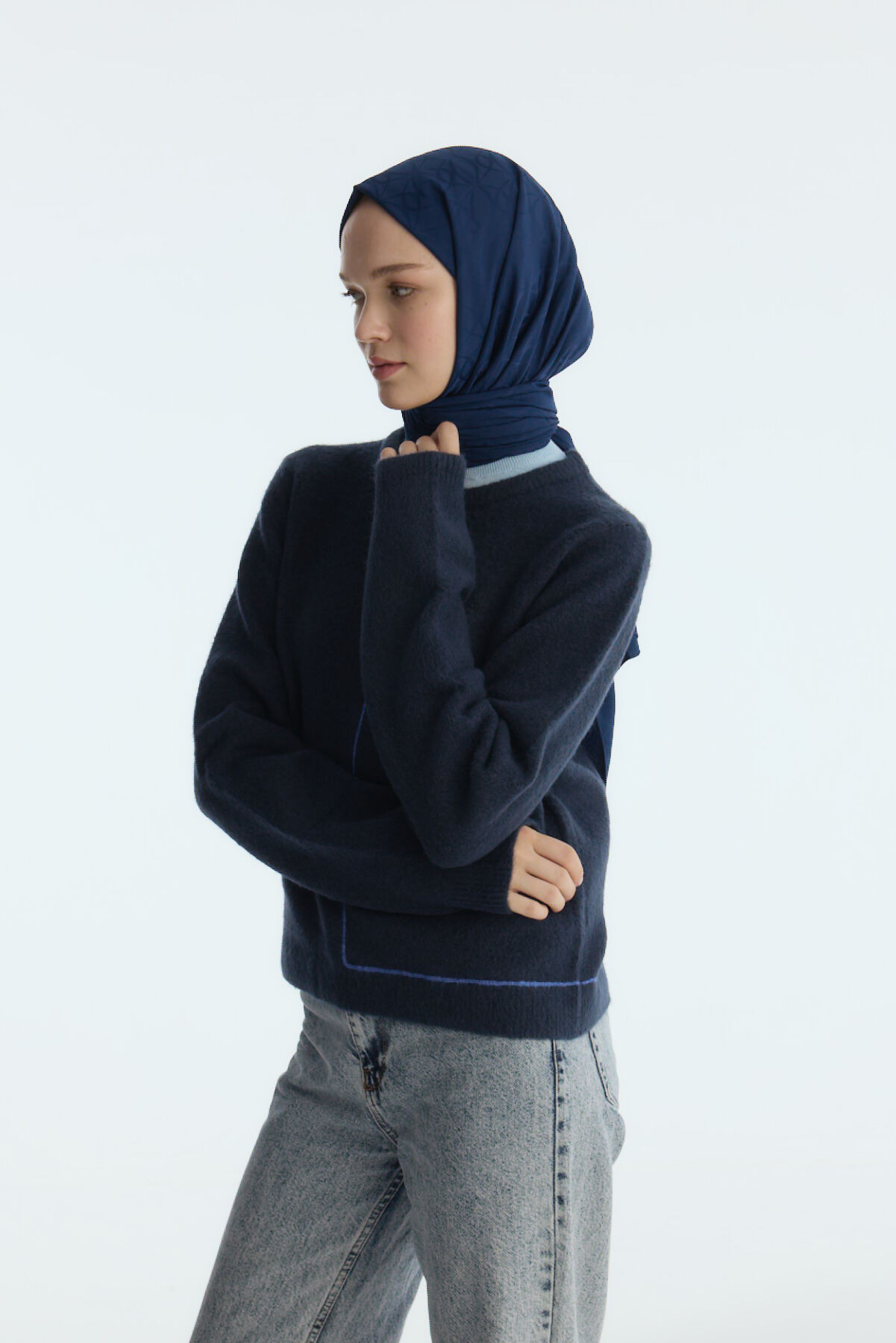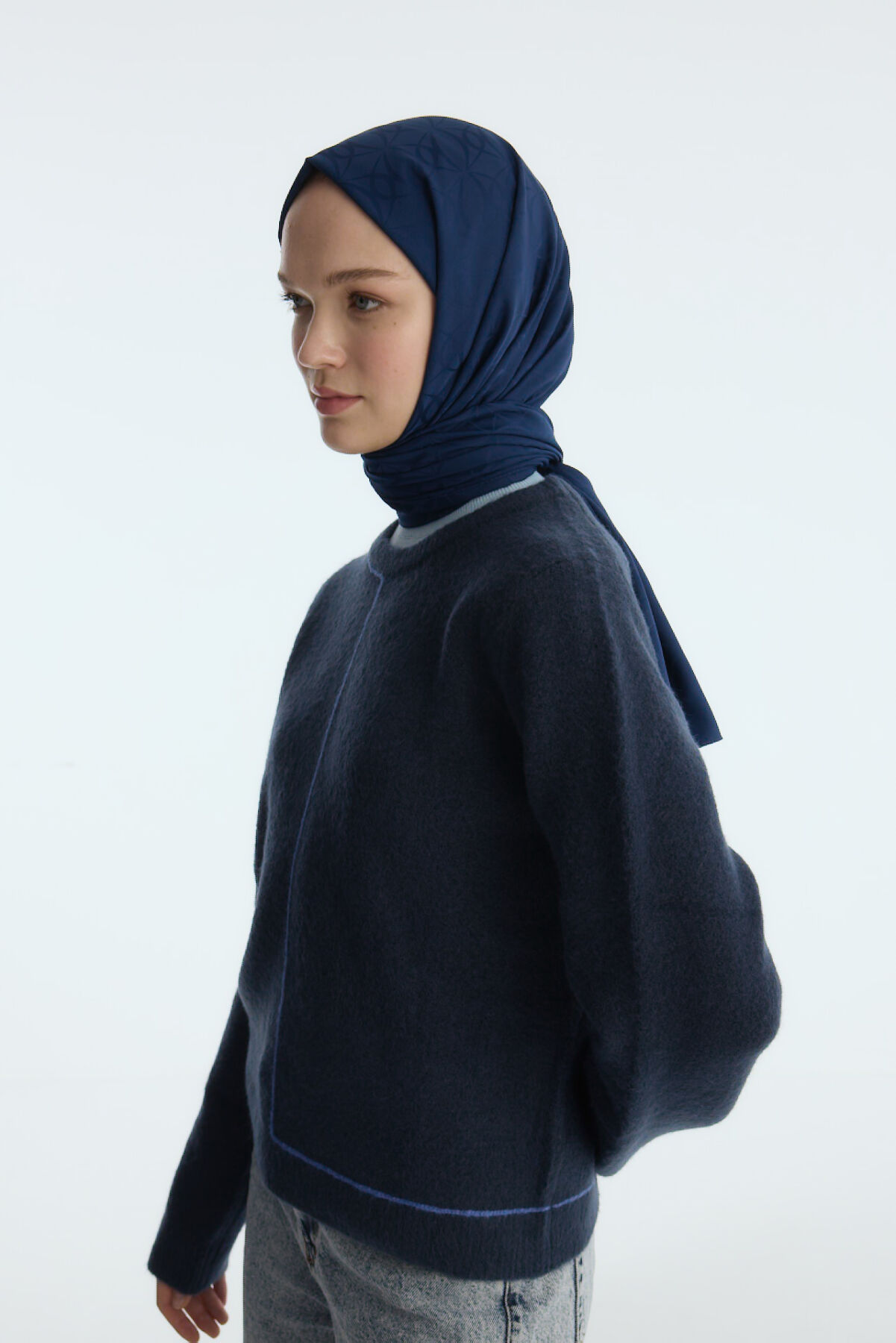 Camellia Scarf ile Asil Görünüm -İpeksi Jakar Geometrik Desen Şal - Lacivert şal, zarif jakar dokusu ve doğal yapısıyla her kıyafete uyum sağlar. Yumuşak ve nefes alabilen kumaşı, size her mevsim rahatlık sunar.