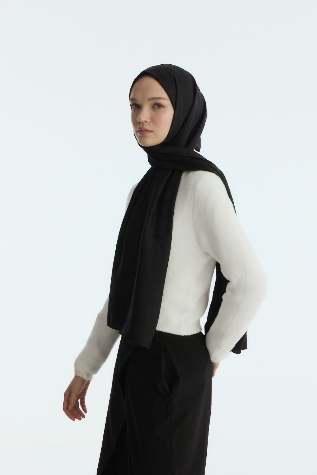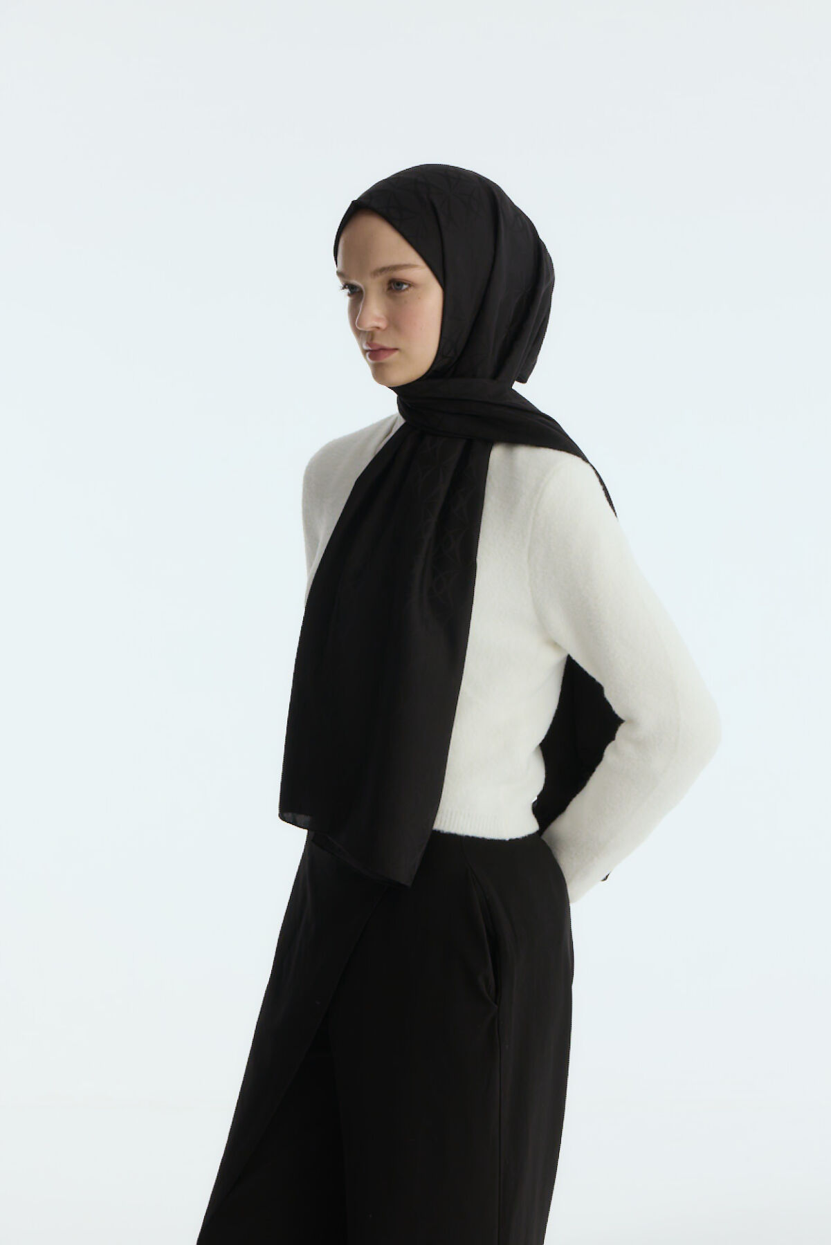 Camellia Scarf ile Asil Görünüm -İpeksi Jakar Geometrik Desen Şal - Siyah şal, zarif jakar dokusu ve doğal yapısıyla her kıyafete uyum sağlar. Yumuşak ve nefes alabilen kumaşı, size her mevsim rahatlık sunar.
