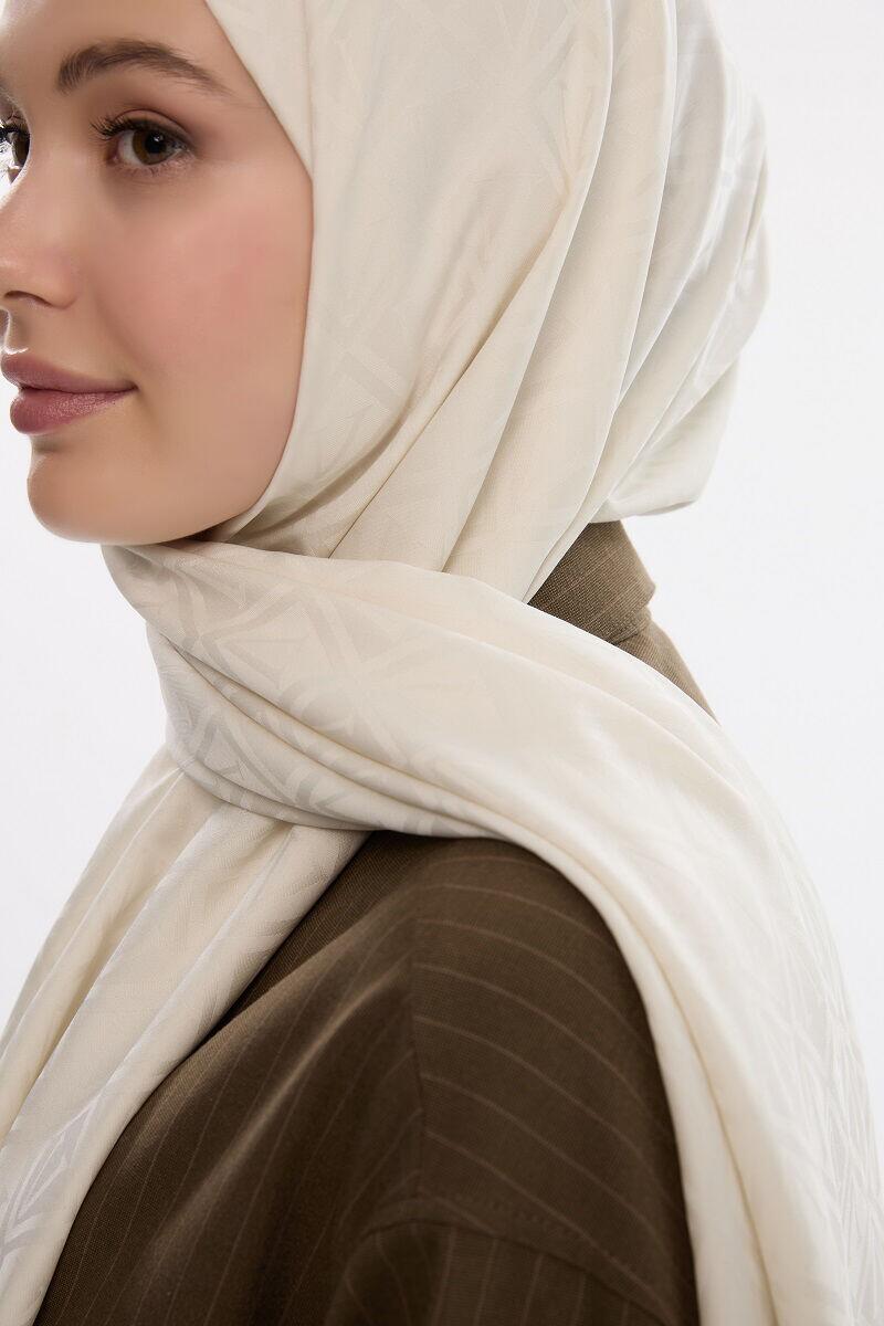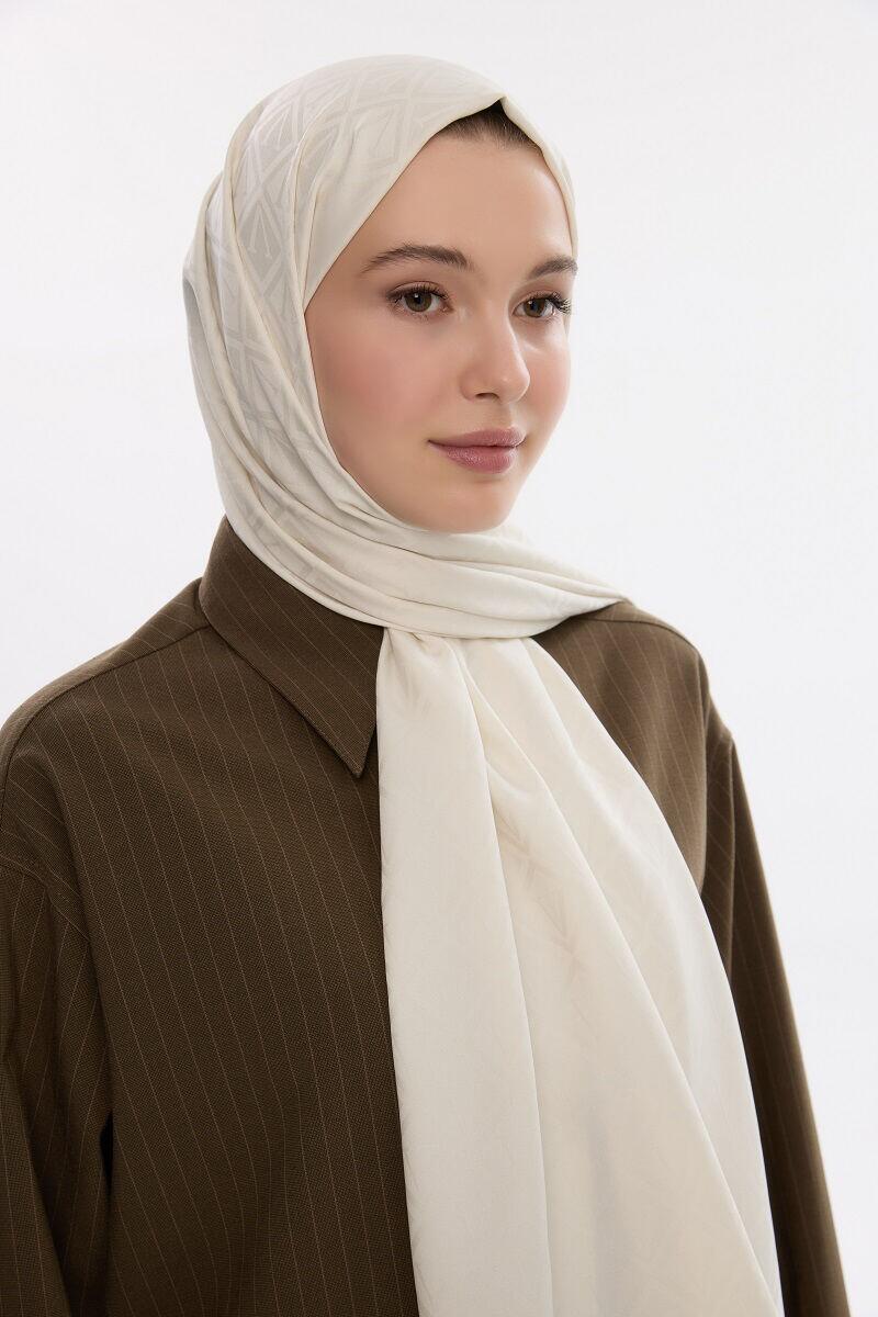 Camellia Scarf ile Asil Görünüm -İpeksi Jakar V Desen Şal - Badem Sütü şal, zarif jakar dokusu ve doğal yapısıyla her kıyafete uyum sağlar. Yumuşak ve nefes alabilen kumaşı, size her mevsim rahatlık sunar.