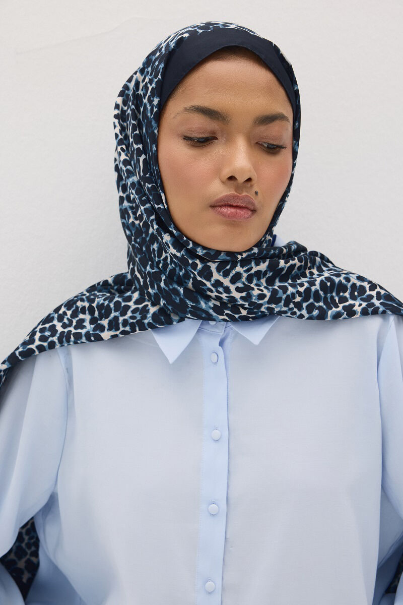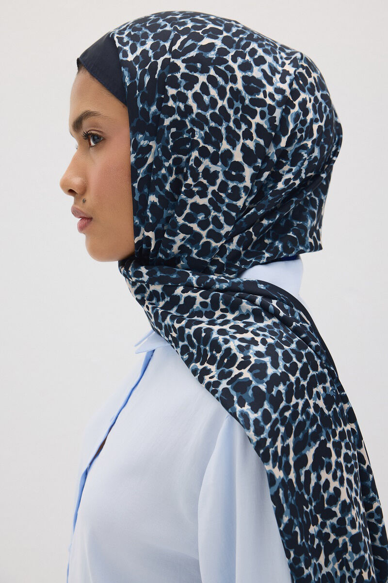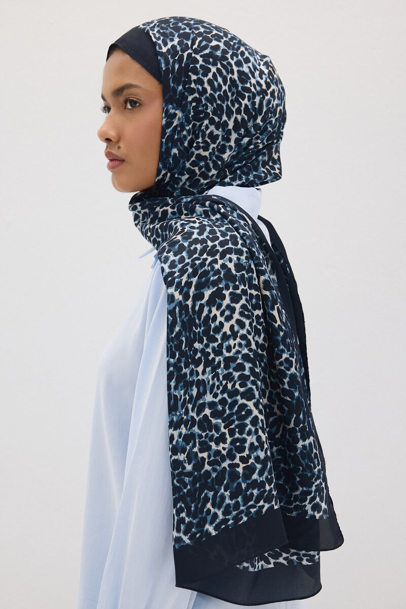 Lumier Collection Leopar Desen Şal Mavi renk ile tarzınızı cesur bir şıklıkla tamamlayın! Bu özel tasarım, ipeksi dokusuyla zarafetin ve konforun mükemmel uyumunu sunar.