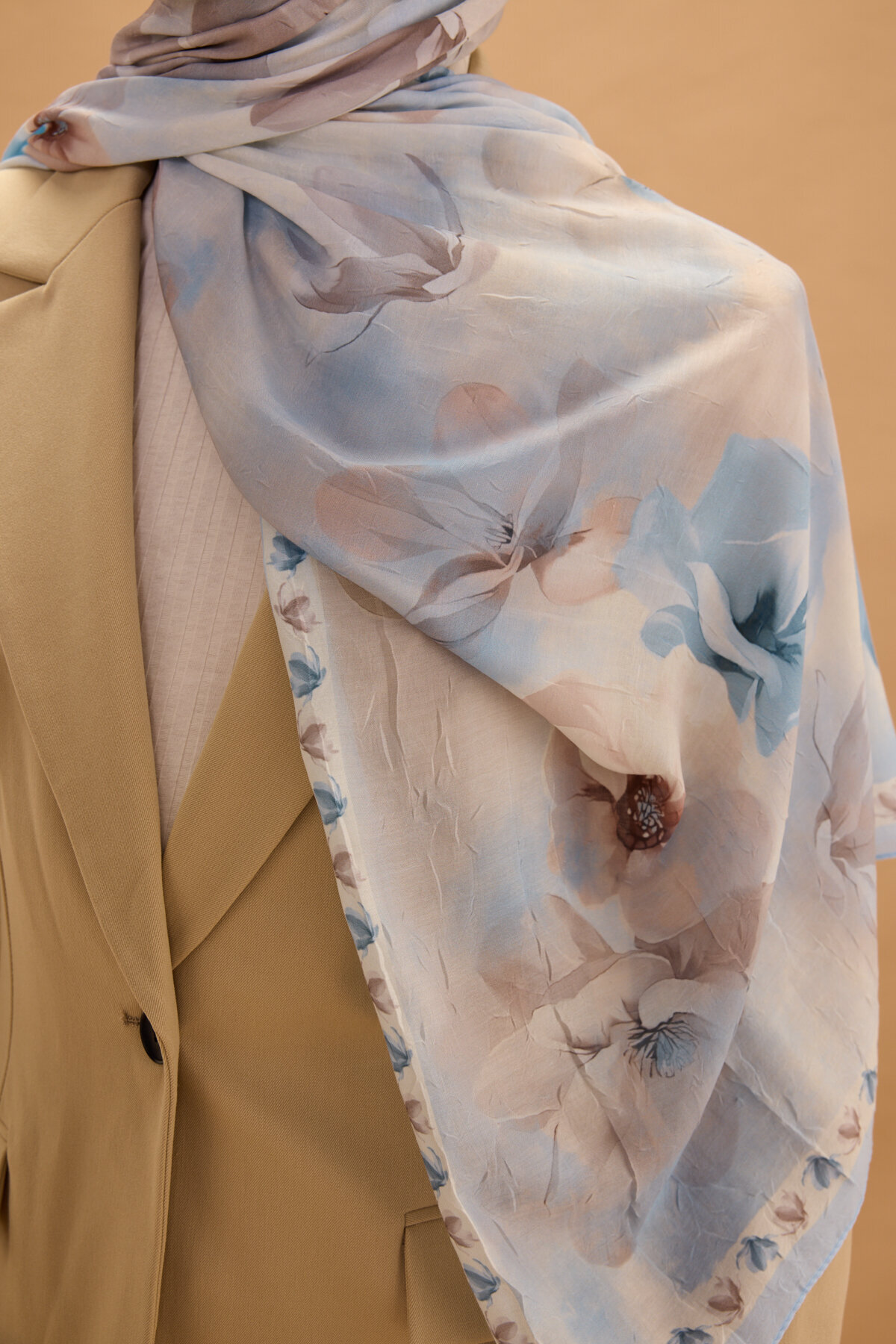 Opera Kraş Şal, Bebe Mavisi renginin huzur veren enerjisini, kraş kumaşın doğal ve modern dokusuyla bir araya getiriyor. Kumaşın kendinden hafif buruşuk yapısı sayesinde hem hacimli hem de tok bir duruş sergileyen bu model, her bağlama stilinde zarafetinizi ön plana çıkarır. Desenlerin kumaş üzerindeki dengeli dağılımı, şalınızı nasıl bağlarsanız bağlayın estetik görünümün korunmasını sağlar.