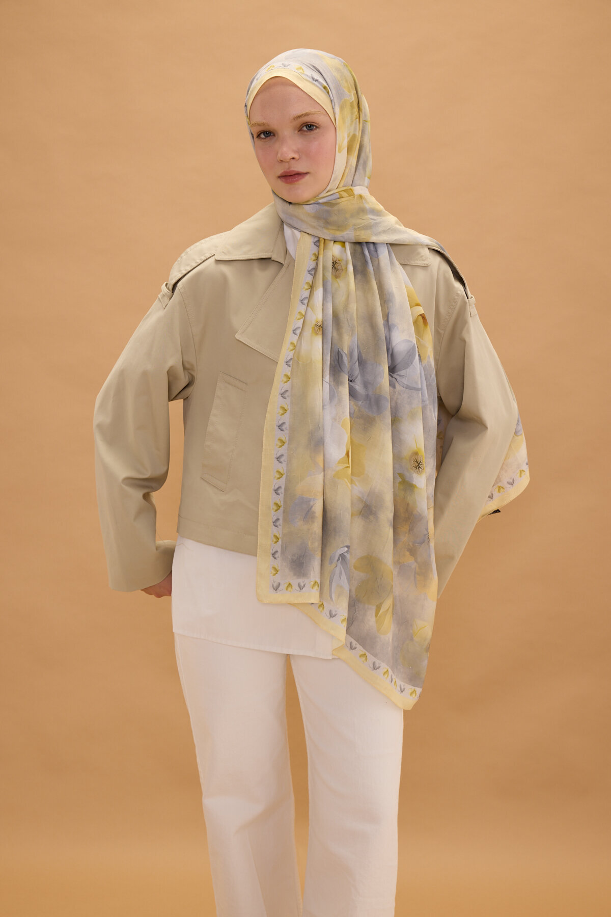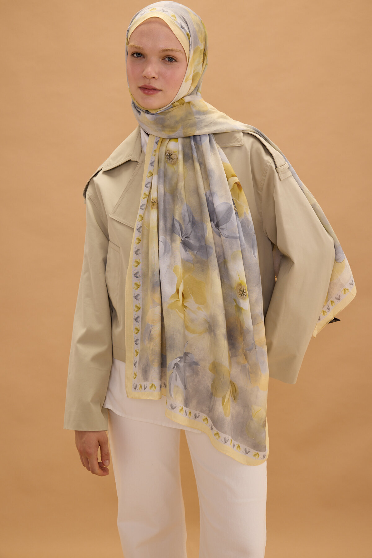 Opera Kraş Şal, Gri Sarı renginin huzur veren enerjisini, kraş kumaşın doğal ve modern dokusuyla bir araya getiriyor. Kumaşın kendinden hafif buruşuk yapısı sayesinde hem hacimli hem de tok bir duruş sergileyen bu model, her bağlama stilinde zarafetinizi ön plana çıkarır. Desenlerin kumaş üzerindeki dengeli dağılımı, şalınızı nasıl bağlarsanız bağlayın estetik görünümün korunmasını sağlar.