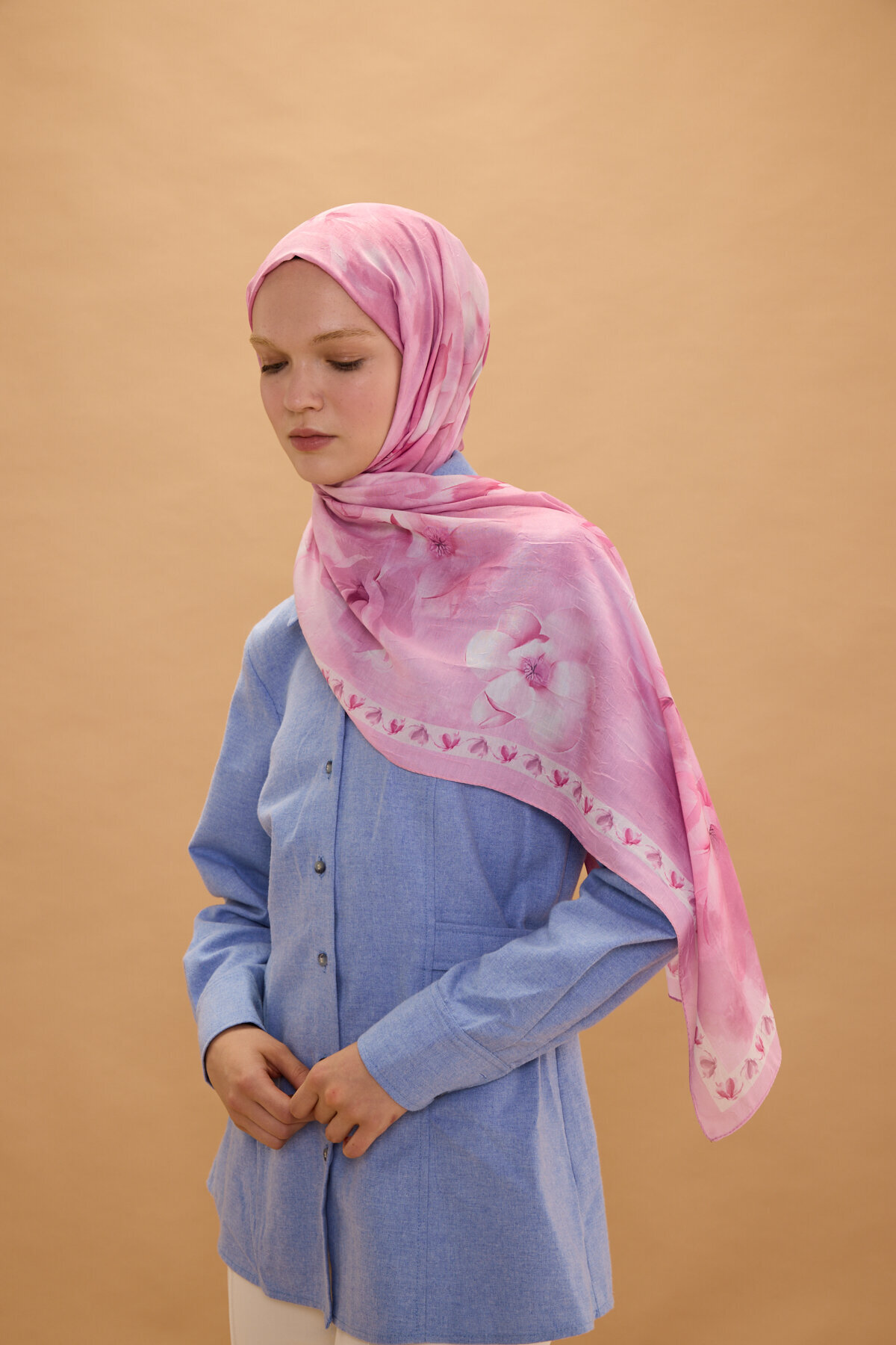Opera Kraş Şal, Pembe renginin huzur veren enerjisini, kraş kumaşın doğal ve modern dokusuyla bir araya getiriyor. Kumaşın kendinden hafif buruşuk yapısı sayesinde hem hacimli hem de tok bir duruş sergileyen bu model, her bağlama stilinde zarafetinizi ön plana çıkarır. Desenlerin kumaş üzerindeki dengeli dağılımı, şalınızı nasıl bağlarsanız bağlayın estetik görünümün korunmasını sağlar.
