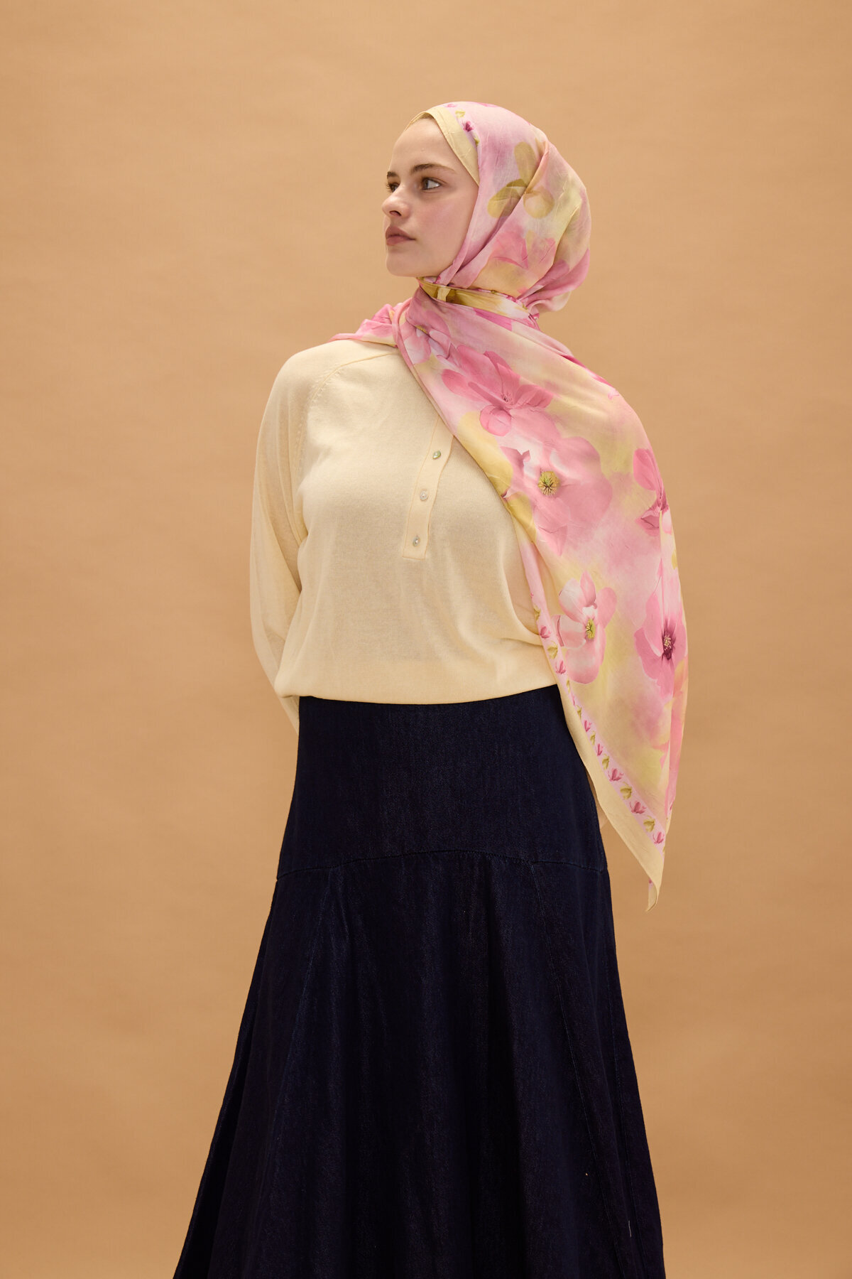 Opera Kraş Şal, Pembe Sarı renginin huzur veren enerjisini, kraş kumaşın doğal ve modern dokusuyla bir araya getiriyor. Kumaşın kendinden hafif buruşuk yapısı sayesinde hem hacimli hem de tok bir duruş sergileyen bu model, her bağlama stilinde zarafetinizi ön plana çıkarır. Desenlerin kumaş üzerindeki dengeli dağılımı, şalınızı nasıl bağlarsanız bağlayın estetik görünümün korunmasını sağlar.
