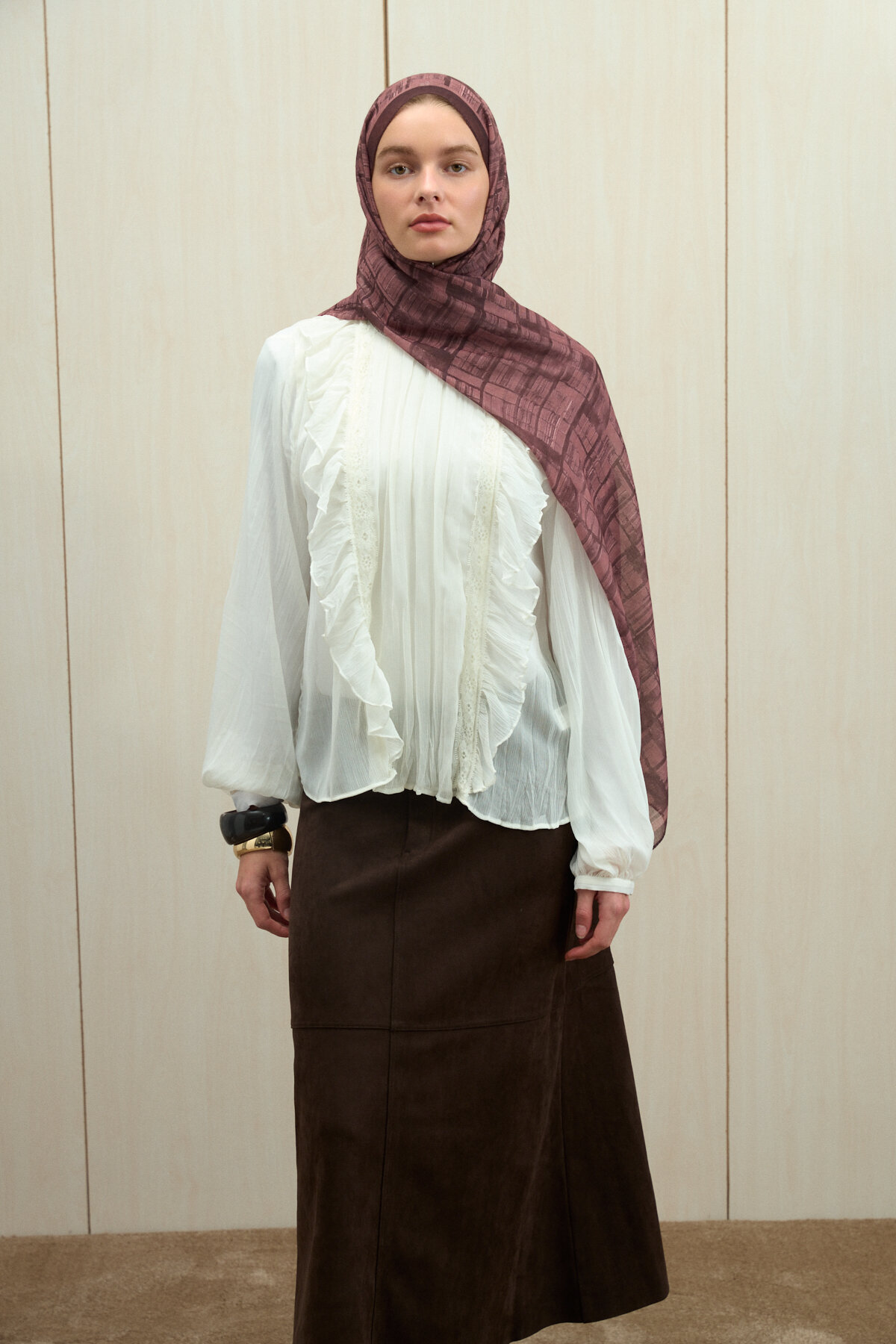 Valentina Soft Pamuk Şal, Erik Çürüğü renginin estetiğini ve Soft Pamuk kumaşın karakteristik mat dokusunu zarif bir çizgide buluşturuyor. Viskon ve Soft Pamuk karışımının sunduğu doğal yapı, şala hem tok bir duruş hem de gün boyu süren bir hafiflik kazandırır. Her türlü bağlama stilinde formunu koruyan bu model, modern kadının hem günlük hem de klasik gardırobuna kusursuz bir uyum sağlamak için tasarlandı.